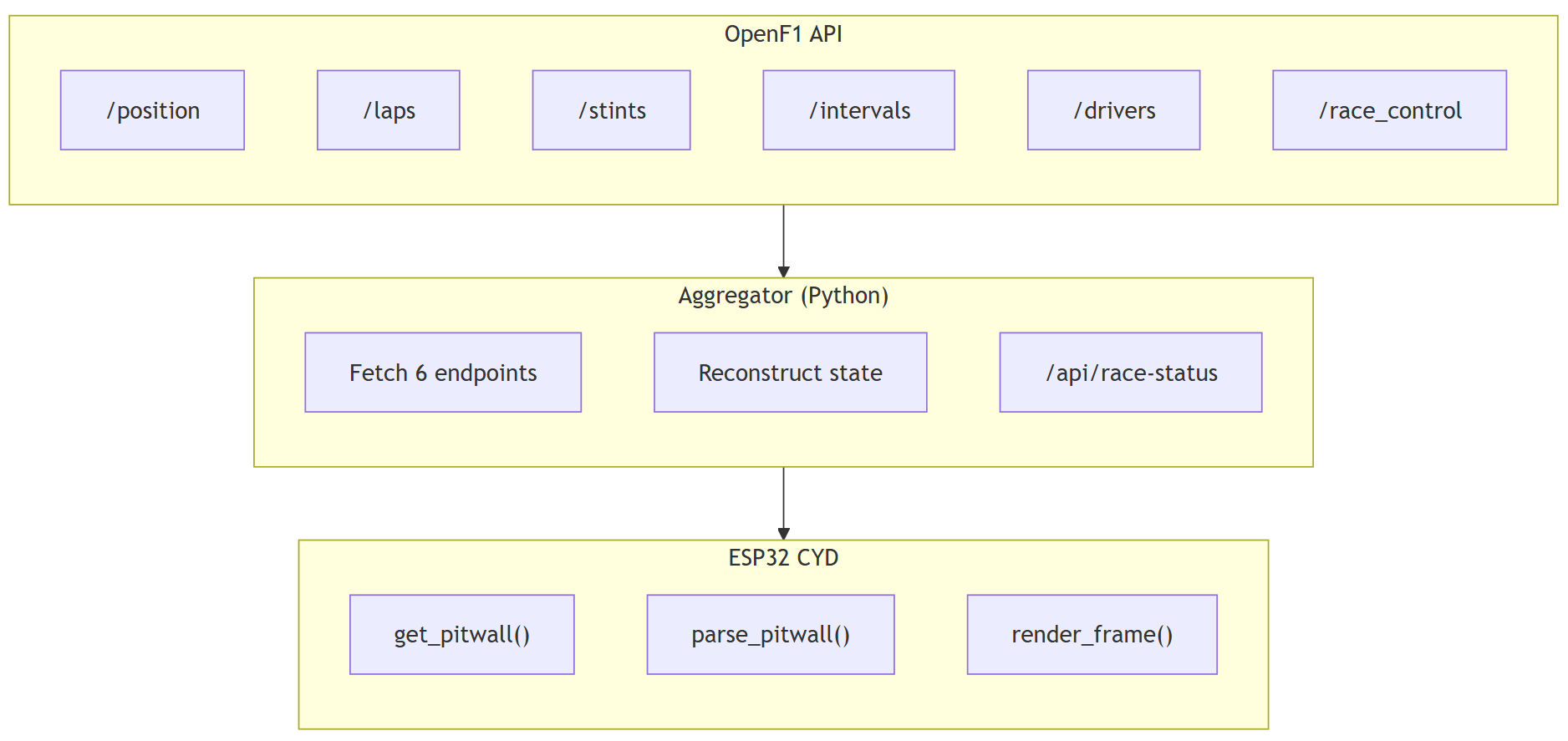 You move the aggregation off the microcontroller entirely and onto anything with more headroom, like a Raspberry Pi, a spare machine, a Docker container, whatever is already running on your network. That server fetches all six OpenF1 endpoints, reconstructs current race state, and exposes a single endpoint: /api/race-status.