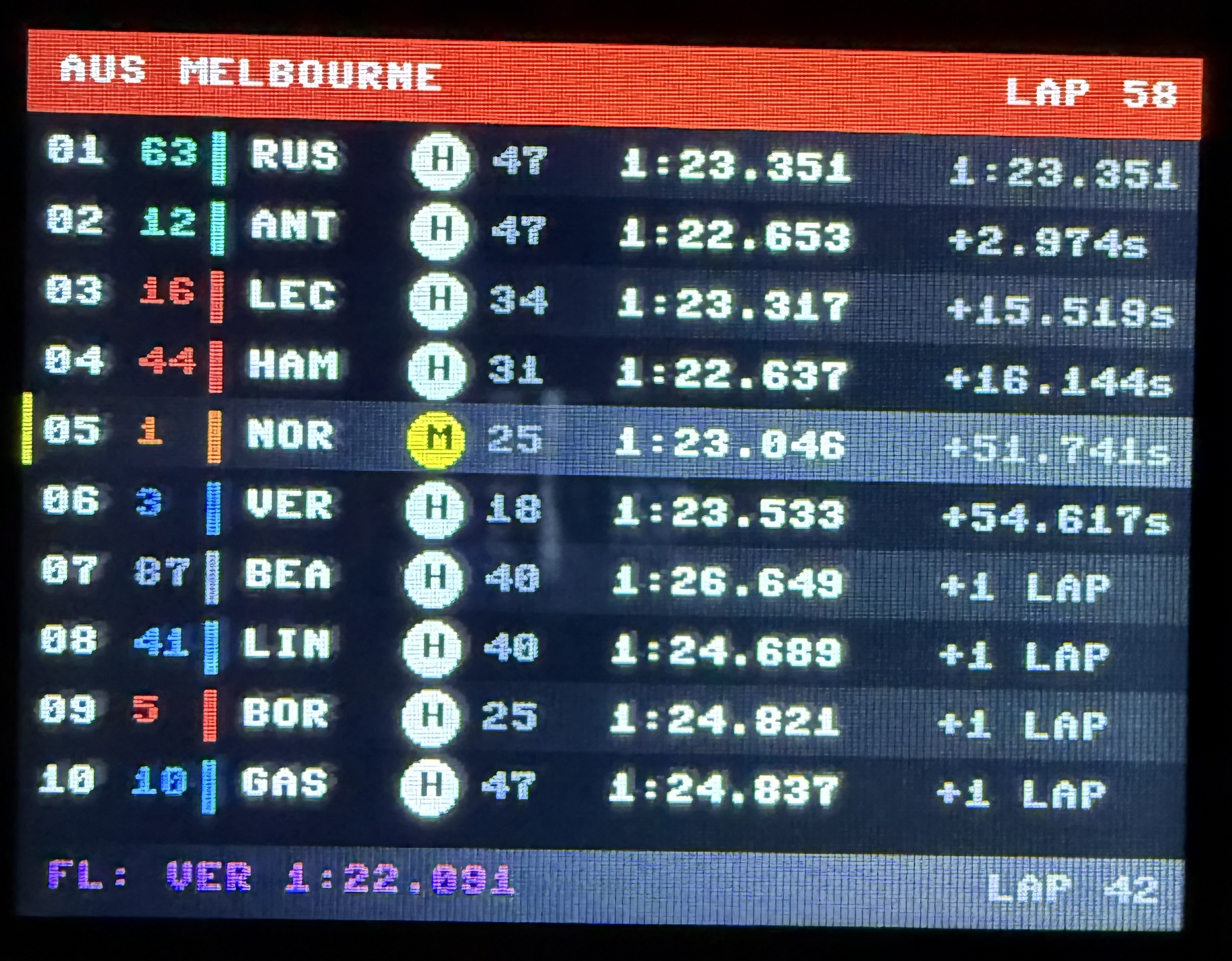 /intervalsis slow to populate (first few laps), the fallback to lap-time delta is rough, similar lap times can show near-zero gaps that don't reflect track position. It should correct itself after a couple of laps. - 8×8 font: Readable but unforgiving. Nine characters per column max; names are always three-letter codes. Fine for F1 (NOR, RUS, LEC); worth knowing if you adapt the layout for another sport.