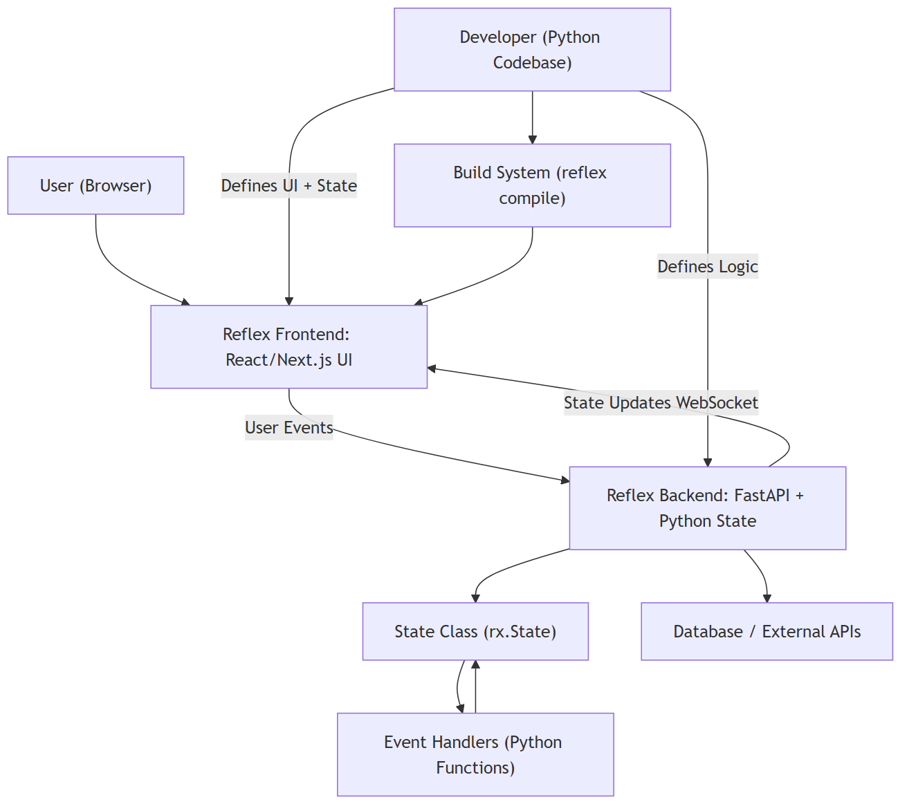 Behind the scenes, Reflex runs a Python backend (based on FastAPI) that handles state management, event handling, and real-time communication between the UI and server via WebSockets.