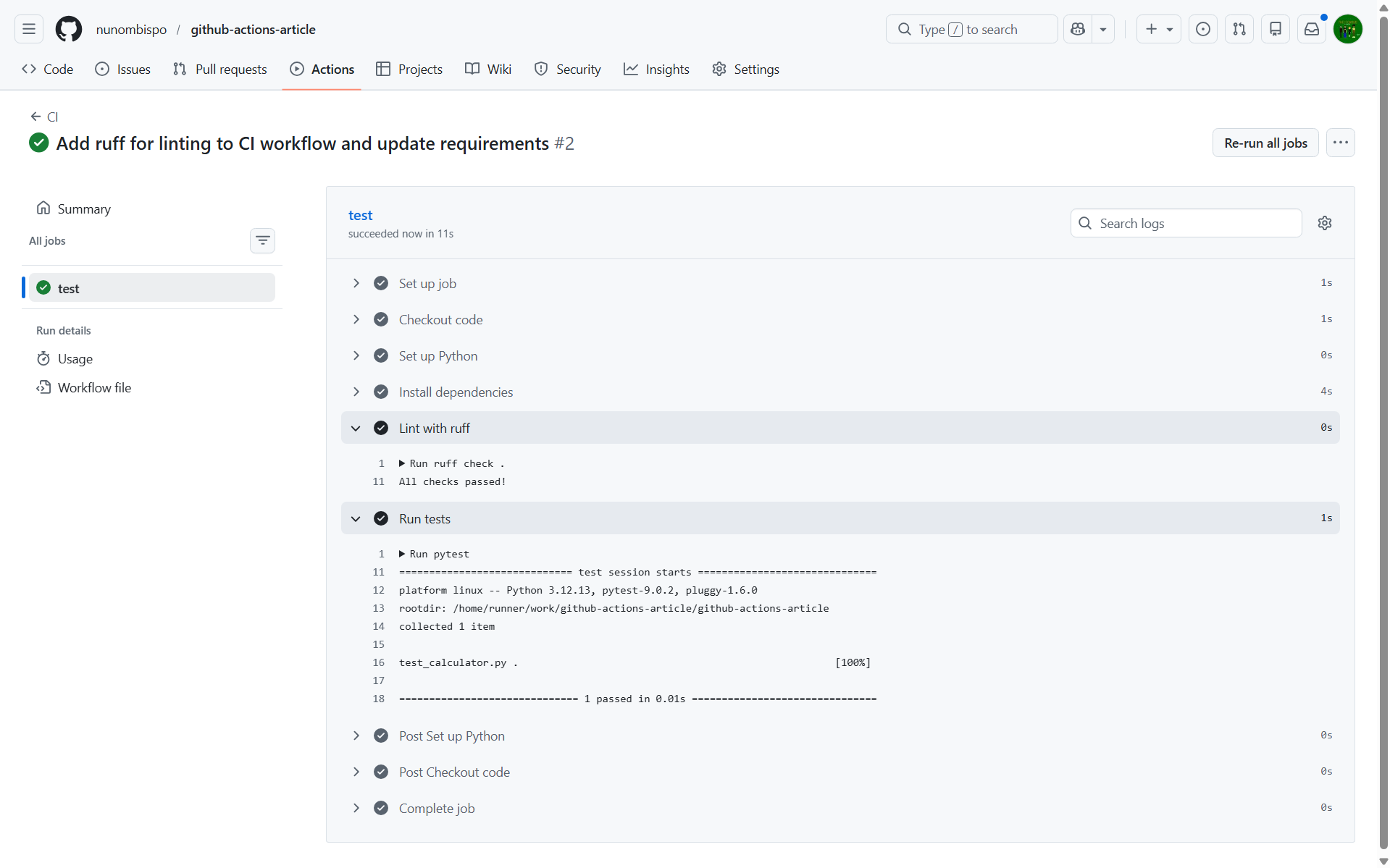 If ruff finds any issues, the step fails and the rest of the job stops. Fix the warnings locally with ruff check --fix . before pushing, and your pipeline stays green.
