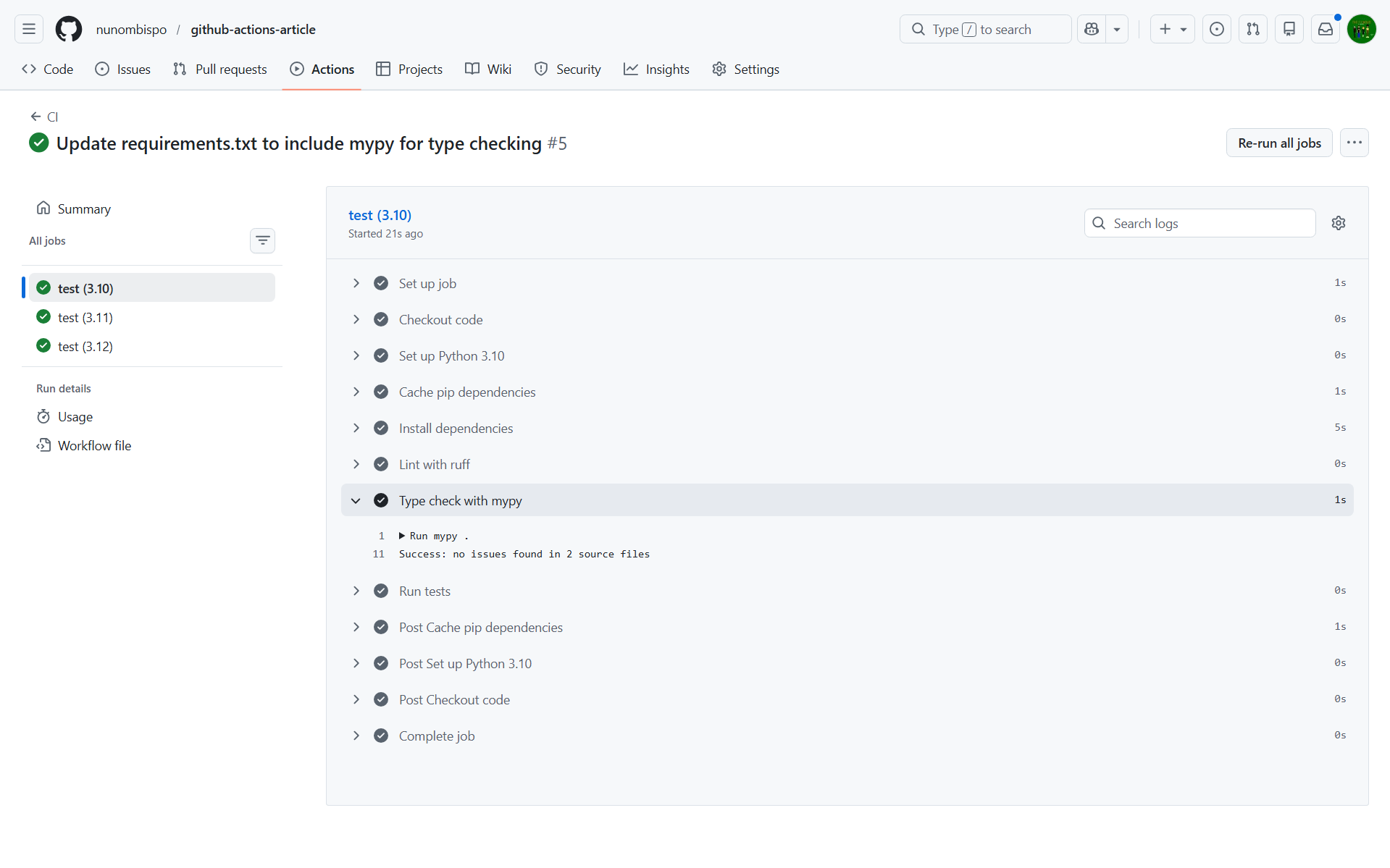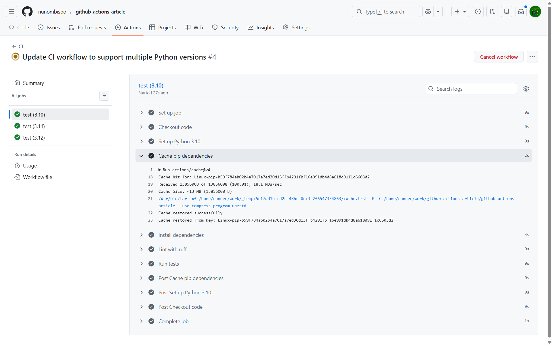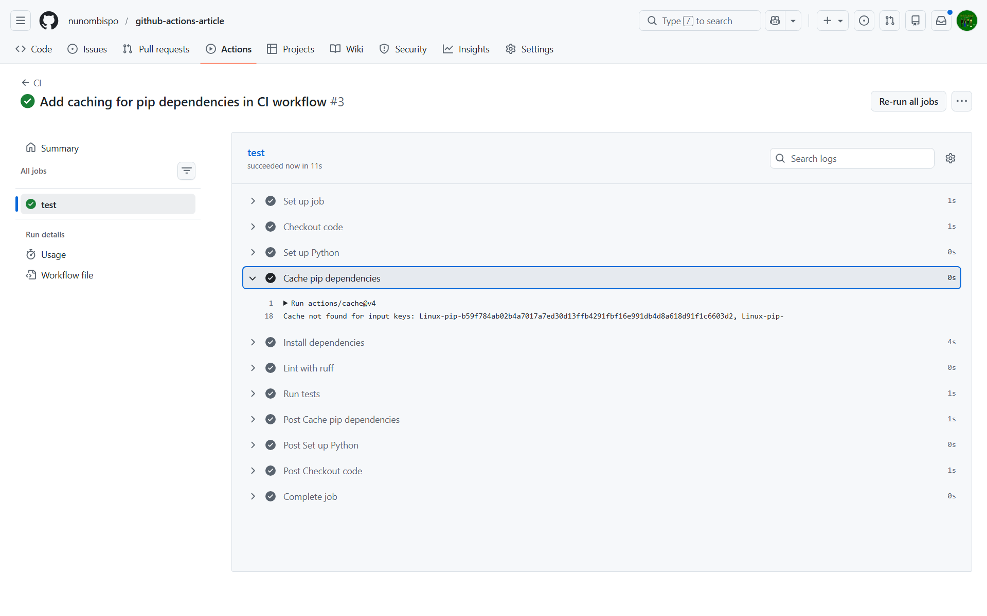 Every time your workflow runs, the runner starts from a clean machine and reinstalls your dependencies from scratch. For small projects this is fine, but as your requirements.txt grows, that pip install step gets slower.
