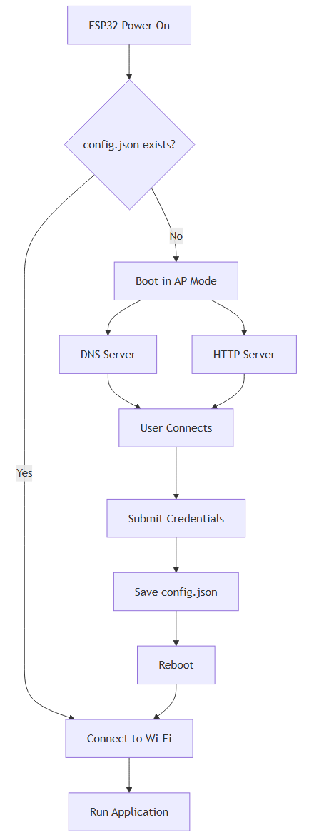 The key decision happens at boot: does config.json exist? If yes, connect to Wi-Fi. If no, start the captive portal.