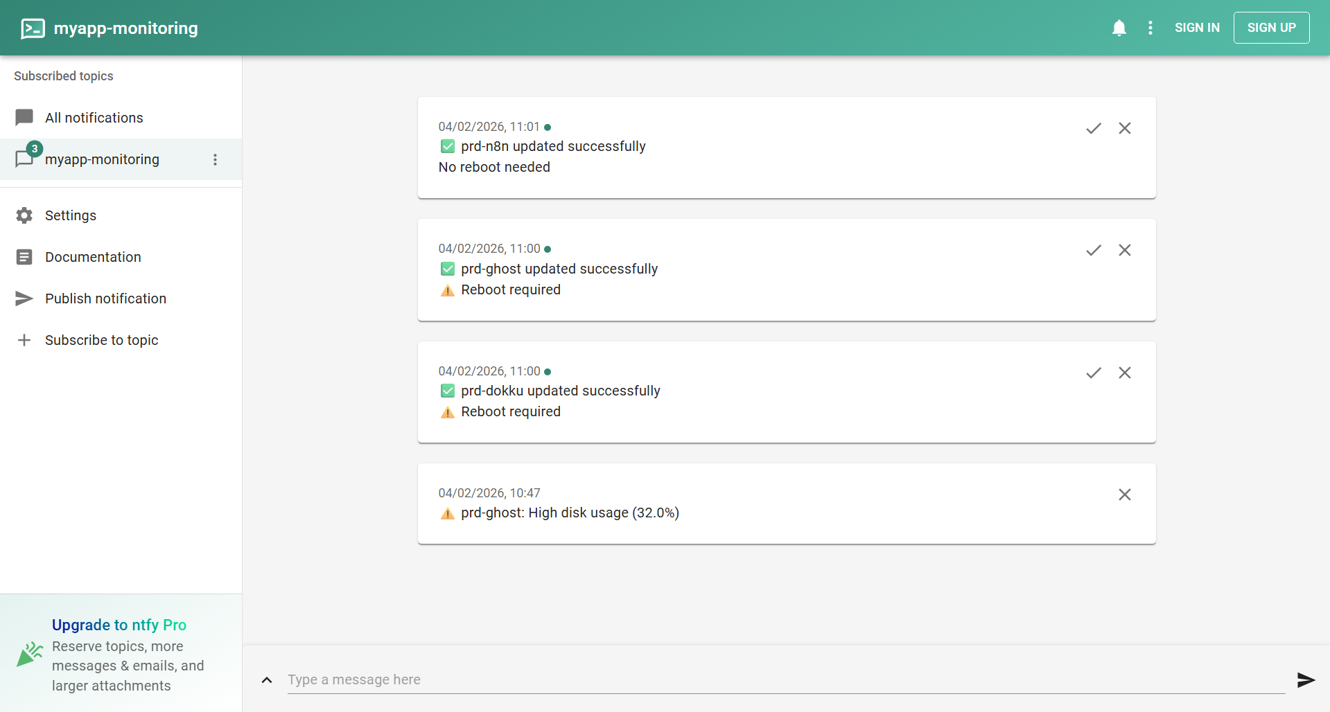 The script will connect to each server, run apt-get update && apt-get upgrade -y (with output streamed so you see progress), check if a reboot is needed, and send you a notification via ntfy:
