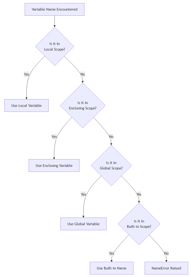 Python searches these scopes from top to bottom, stopping at the first match. If a variable exists in multiple scopes, Python uses the one it finds first in this order, which is why local variables can "hide" global ones.